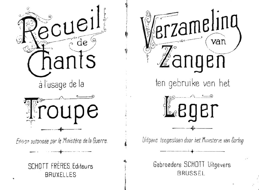 De Verzameling van Zangen ten gebruike van het Leger (Uitgave toegestaan door het Ministerie van Oorlog, Gebroeders Schott Uitgevers, Brussel). Marraine raapte het boekje op gedurende de vlucht naar Holland in augustus 1914.